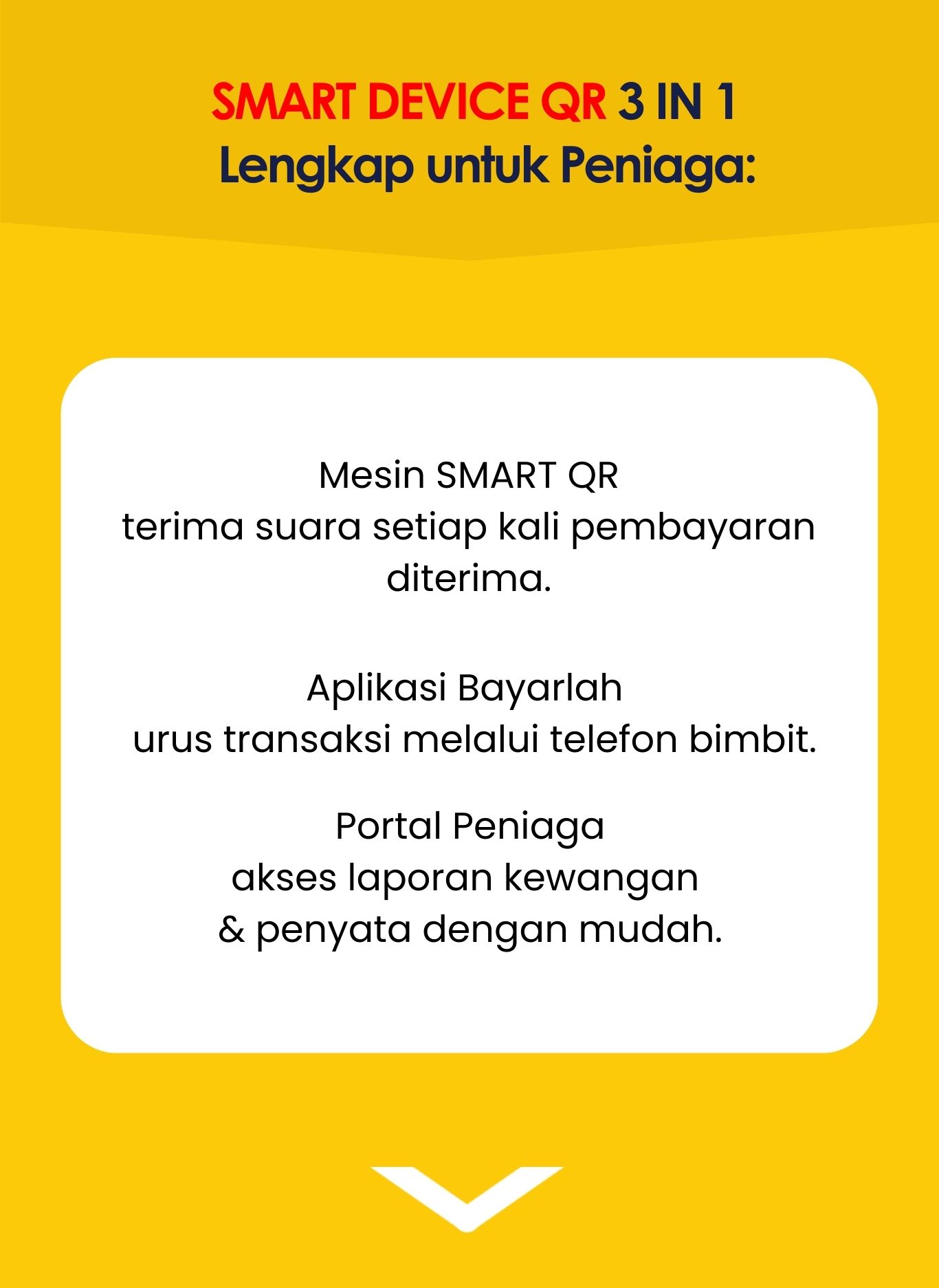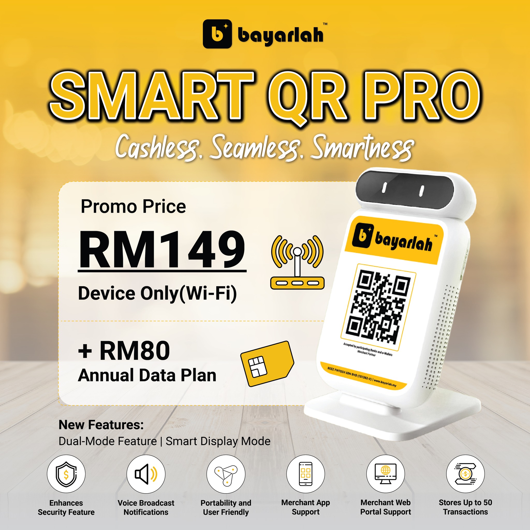 SMART QR PRO adalah mesin QR pintar yang membolehkan peniaga menerima pembayaran digital melalui pelbagai aplikasi pembayaran seperti DuitNow, TNG, ShopeePay, GrabPay, dan banyak lagi. Ia juga dilengkapi dengan aplikasi mudah alih dan portal web untuk memudahkan peniaga menguruskan transaksi dan laporan bayaran.